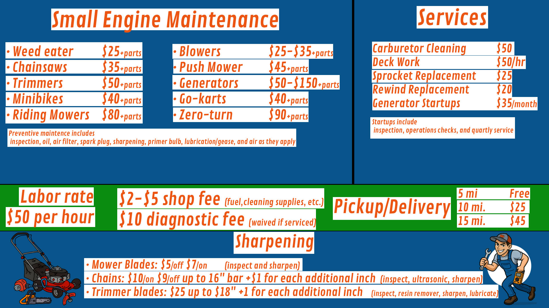 Veteran owned and operated small business offering small engine repair, monthly generator startups, and handyman services to the northern Ocala area.